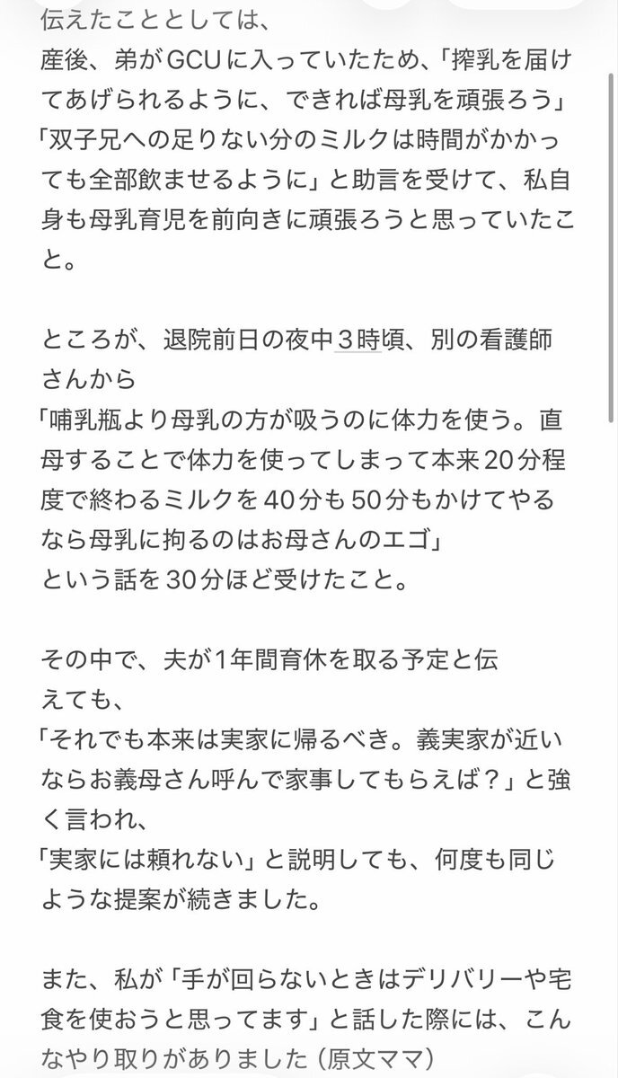私も退院の前日、若い看護師に言われた。子ども小さめだったし総合病院だったからとにかく3kgまではしっかりミルク飲ませるようにの指導で母乳に関しては全然。結果生後2ヶ月まで混合でその後完ミ。なんかミルクでいいならもういいやってなるししっかり産後うつだった。 x.com/homari_117/sta…